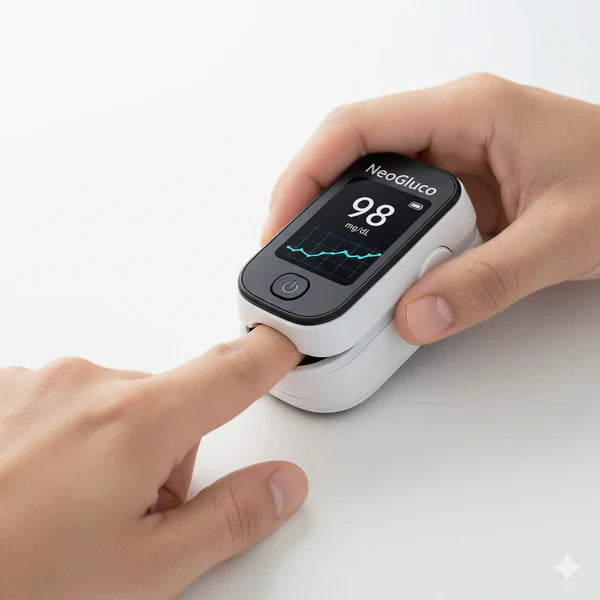 Mientras los medidores viejos requieren sangre, NeoGluco™ utiliza un sensor óptico avanzado con Inteligencia Artificial (IA). Al colocar su dedo, el sensor analiza la composición de su sangre a través de la piel, y nuestro chip de IA procesa la información para entregar una medición precisa.